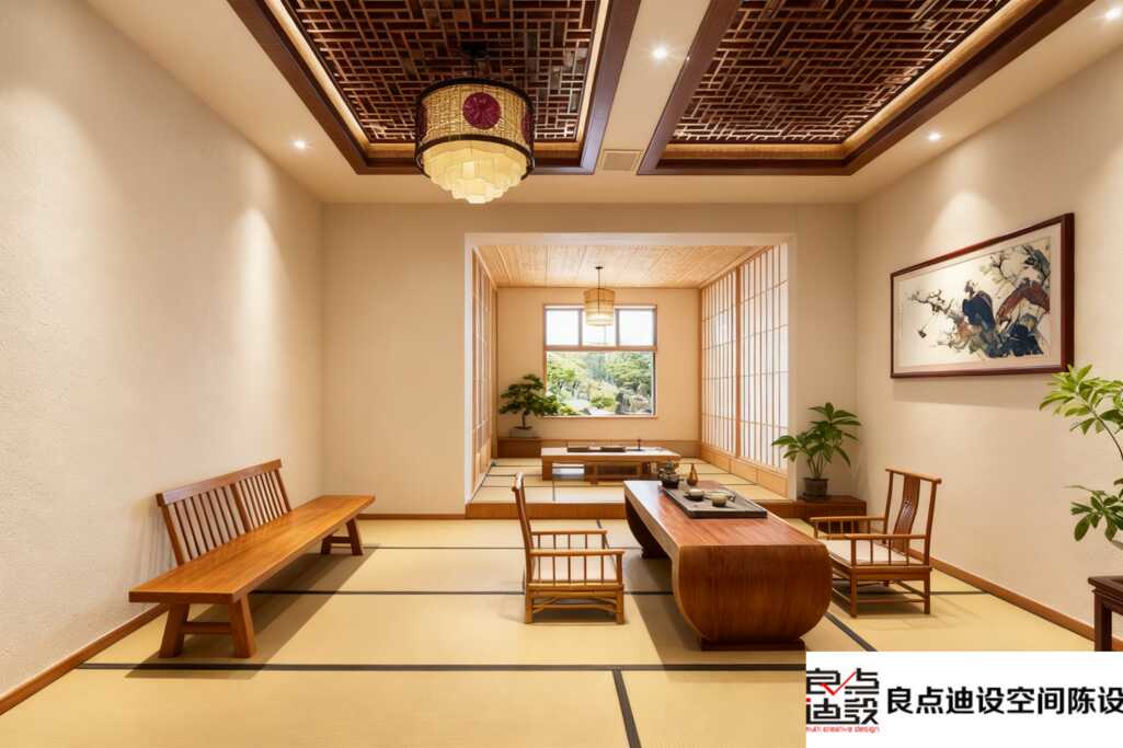 先瞅瞅整体格局!核心区域用了日式经典的榻榻米,但搭配的不是传统日式矮桌,而是融入了中式木质家具的温润线条。那种原木色的质感,摸上去扎实又自然,坐垫是沉稳的棕色调,不仅视觉上压住了场子,坐感也是***,久坐不累。这种“底子”上的混搭,一下子就定下了“东方美学融合”的基调,妙啊。