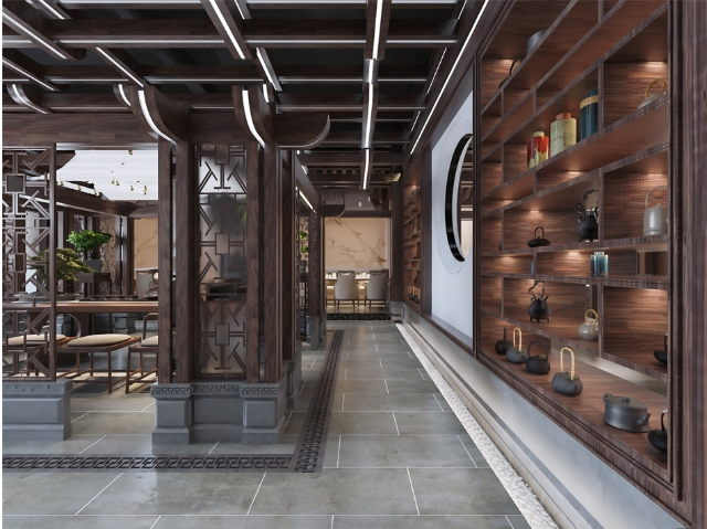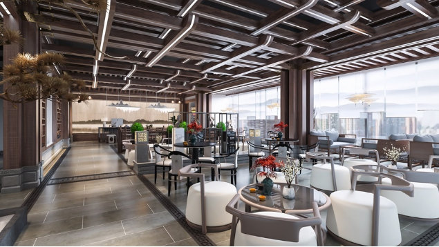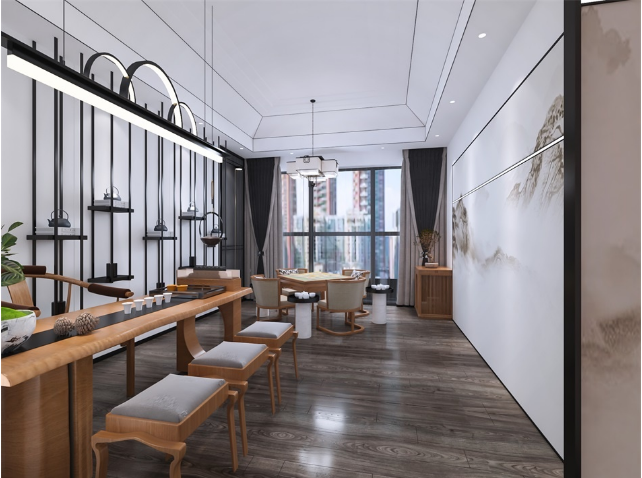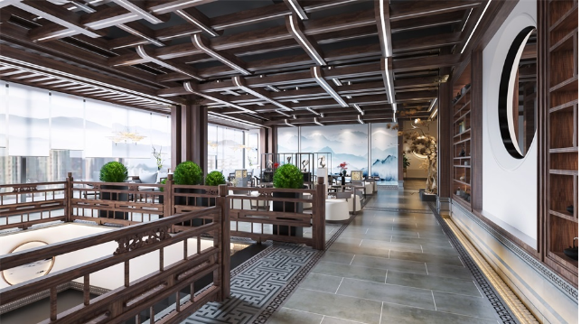 本案是一家中式禅意茶楼,整体风格利用棕色搭配白色色调,来凸显中式格调,结合古典装饰元素,来表现中国风。