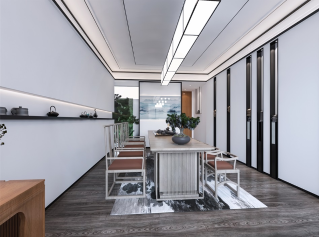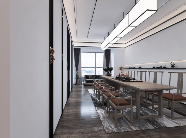 大面积落地玻璃将自然光引入室内,使得室内宽敞明亮,使用局部灯光照明,视觉效果上增加了空间的层次感。干练的硬装彰显豪迈的气派,白净优雅的软装则体现极简的中国风茶室。