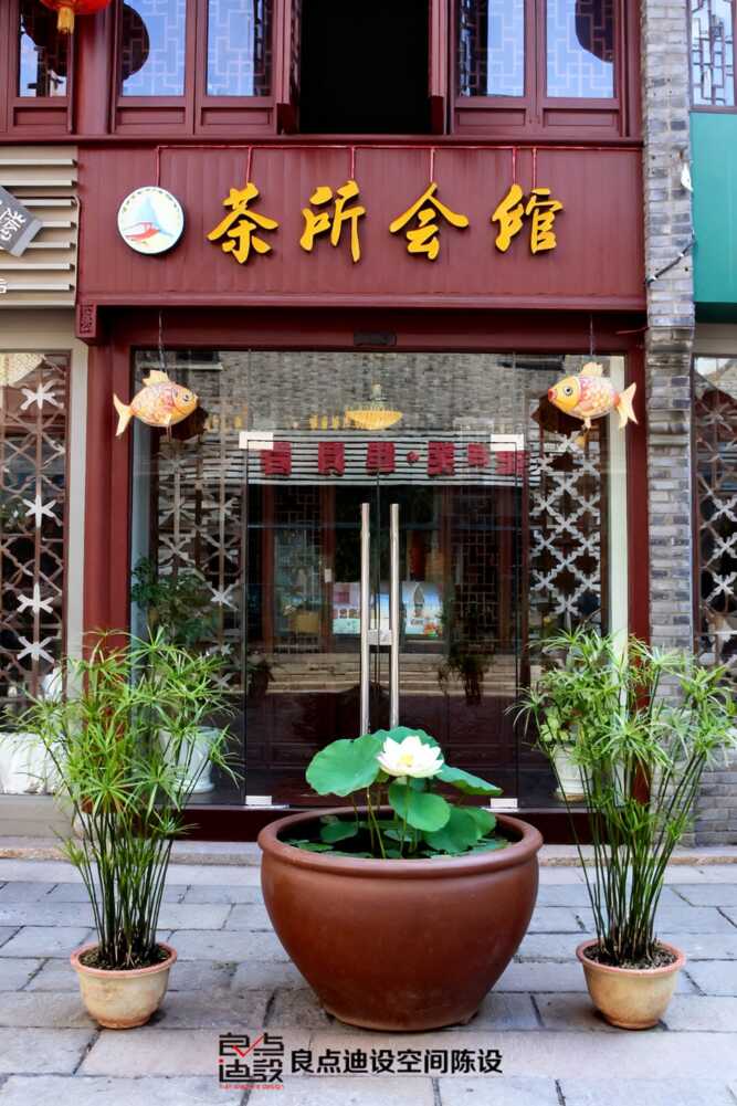 深红色调打底,配上烫金大字"茶所会馆"。传统又不失气势,路过都忍不住多看两眼。门口那对鱼形挂饰太灵动了,寓意吉祥还超有辨识度。