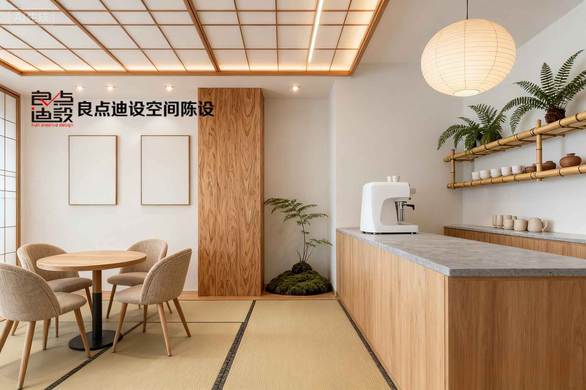 灯光更是心机满分!木质格子天井嵌了暖光灯带,光线透过宣纸灯罩柔得像自带滤镜。墙上留白画框和角落苔藓盆栽里的蕨叶,瞬间把自然感拉满。整体木色+米白+浅咖的配色,治愈又不失高级,手机原相机直出都能火!