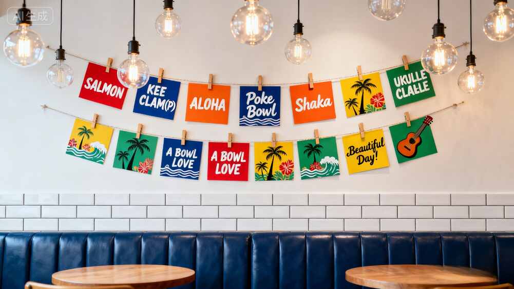 墙上那张海报才是灵魂所在!"Poke Makes My Day Everyday"这句话简直写到打工人心坎里了,配上诱人的波奇碗图片,看着就让人食欲大开。右上方那个复古灯泡更是点睛之笔,暖黄光线洒下来,连水泥墙都变得温柔起来。