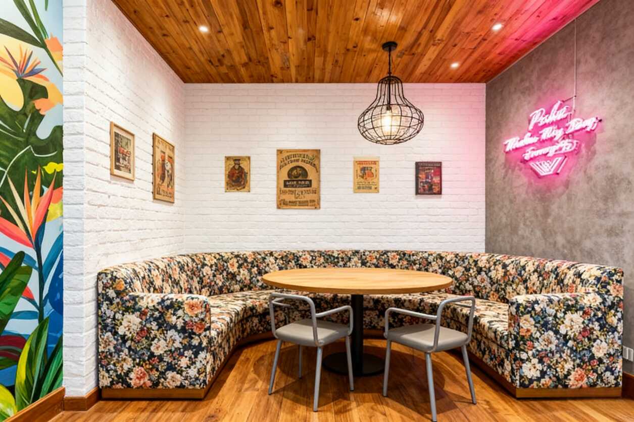 弧形沙发+霓虹灯!这家餐厅的复古混搭风软装设计太绝了,随手一拍都是朋友圈大片