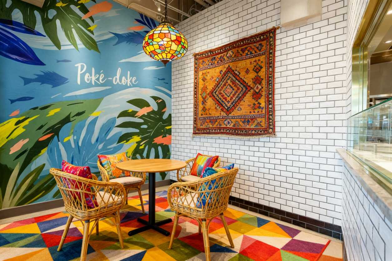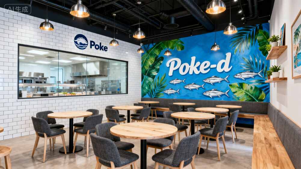 这家Poké-doke餐厅软装设计把海边度假风玩明白了!蓝白配色+藤编元素,随手一拍就是ins大片