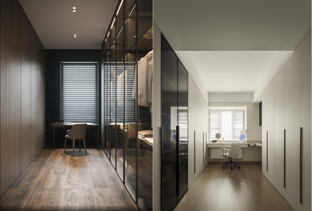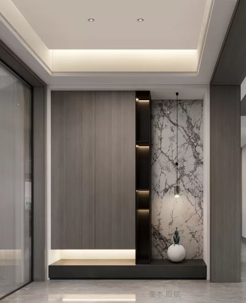 对于无玄关的户型,入户门左右侧有较长的靠墙区域,且安置鞋柜后不会阻碍空间的利用,那么可以将鞋柜平行布局在门体的一侧。柜子与门体位于同一方向,进门后的空间感依旧保持宽松舒适,又能实现较大面积的储物收纳空间,狭小的转角区域亦可以得到合理利用。