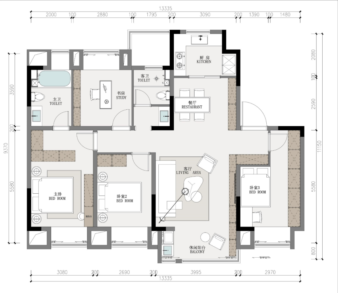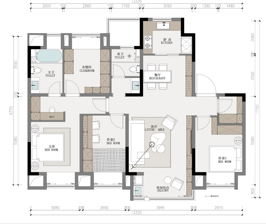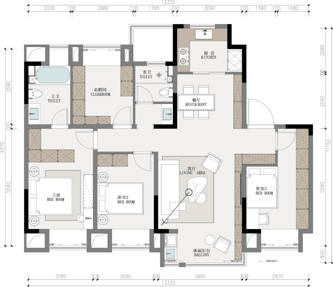 设计思路:阳台打通,打造多功能阳台。增加门厅换鞋柜和餐厅餐边柜的储物功能,保留独立书房。卧室3增加储物空间。