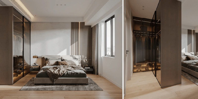 在房顶凹槽处做灯带设计代替原有的主灯,实现极简大方的灯具设计,让整个房间简洁明亮,视觉上房间更加宽敞,L型透明衣柜,在卧室中形成了小型衣帽间,同时能作为隔断,分隔洗浴区和睡眠区,茶色的透明玻璃柜门提升空间的通透感,实用又高级,拿取衣服更加方便,更有一种精致的高级感,让衣柜中的衣服成为一种展示品,美观与实用兼具。
