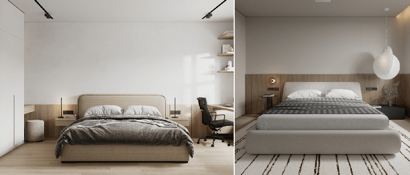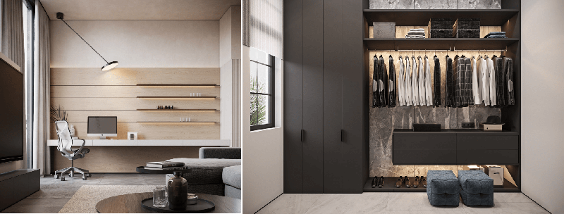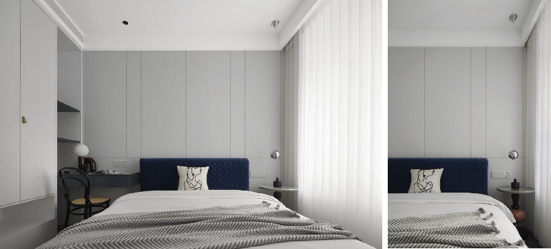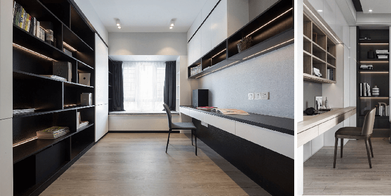鉴于北次卧空间有限,将北次卧做书房+衣帽间二合一的设计,一侧做靠墙书桌,另一侧做到顶衣柜设计,学习储物两不误,家中储物空间充足时,可以将衣柜改造成整墙的书籍收纳,将整个空间变成书房,空间独立不受打扰。