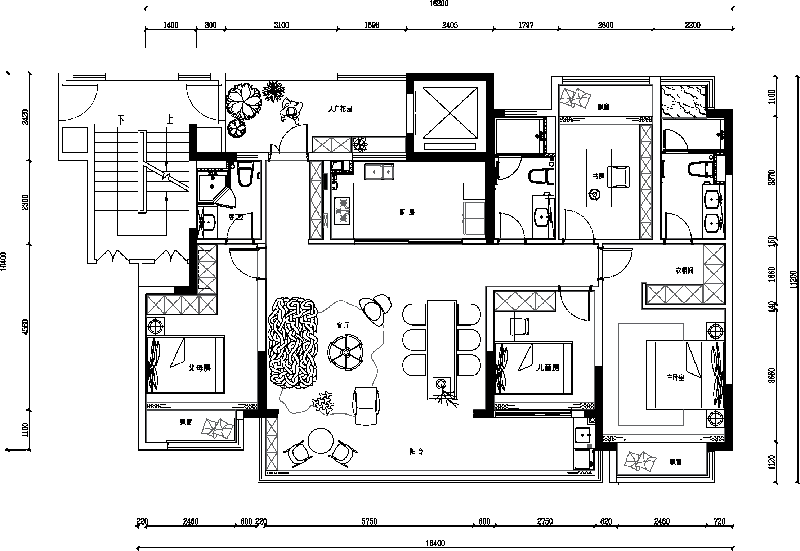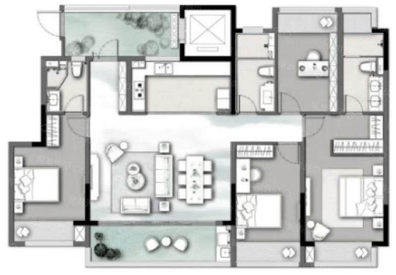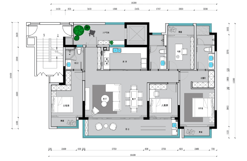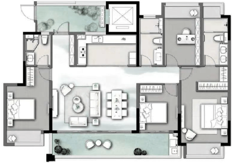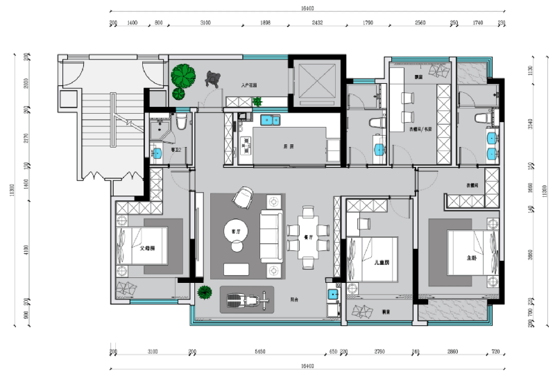 四间卧室,三间朝南,采光充足,父母房中带有独立卫浴,方便老人起夜,卫生间更是要做适老化设计,方便老人居住和使用,沿墙面定制的L型收纳柜,***利用拐角空间,收纳功能强大。儿童房带有飘窗,视觉效果宽敞,改良采光,让房间更加明亮,稍微装饰下,铺几个蒲团,坐在午后的阳光里,看书喝茶撸猫。主卧中L型衣柜设计,形成独立的小型衣帽间,浴室中两个盥洗盆设计,方便男女主人早上上班时,不会出现匆忙争抢的现象。朝北卧室设计成衣帽间和书房,解决家中收纳问题,同时也提供了独立安静的学习工作空间。