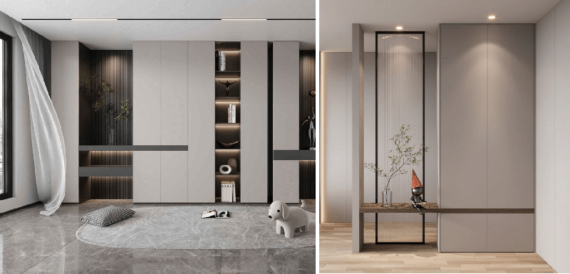 入户玄关让人眼前一亮,鞋柜底部留空,放鞋方便又美观,鞋柜底部可以安装声控灯带,拿取鞋子会更加方便,同时,声控灯带也能给生活增加更多的趣味性,把换鞋凳组合到鞋柜里,做成一体的设计既能保持空间的美观简洁,又能方便换鞋,也是一种比较流行的设计,鞋柜中间留空,随手置物很方便,也能让玄关显得没有那么拥挤。