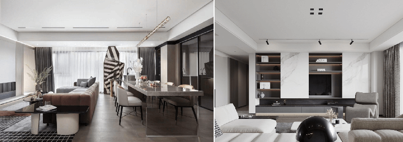 和E2户型中的***稿设计方案相比,第二稿设计方案中,打通了客厅阳台空间,使得整个客餐厅空间更加宽敞明亮,客餐厅空间更加相容,餐桌延长台面装有水池,方便用餐时洗手洗水果等,沙发椅等不规则的设计,使得整个客餐厅空间更具有设计感、时尚感。