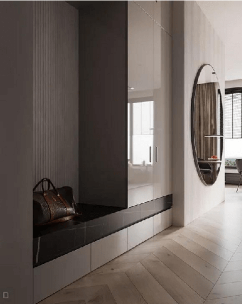 玄关处的装修要集美观度与实用度为一体,鞋柜做到顶设计,***大程度地满足鞋子收纳需求,鞋柜底部留空,方便日?;恍⌒?,玄关处采光度较弱,在鞋柜底部和留空处设计好灯带,增加玄关处的采光照明。