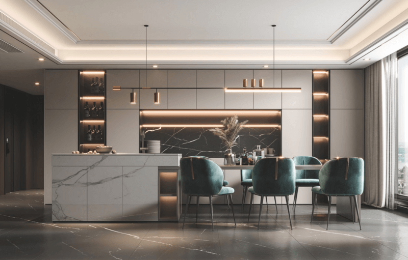 岛台的存在连接了餐厅和厨房,让厨房不在是一个人的做饭空间,让餐桌不再只是一个吃饭的地方,岛台集收纳、料理、用餐与日常休闲和交流情感于一体,让整个家庭氛围更加的和谐。