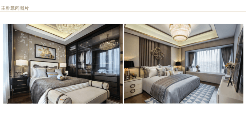 主卧摆放斗柜兼梳妆台功能,由 步入式衣帽间 免除卫生间对着卧室的尴尬,打造两排顶天立地大衣柜,镜面柜门既可当穿衣镜使用,又能扩大视觉空间。