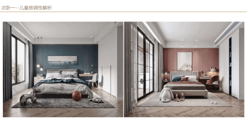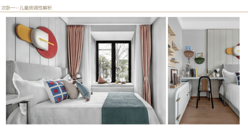 在色彩搭配上,使用 鲜艳明快的色彩 ,不仅可以使儿童保持活泼积极的心理状态和愉悦的心境。而且还能改善室内亮度,造成明朗亲切的室内环境,处在其中,孩子能产生安全感和归属感。