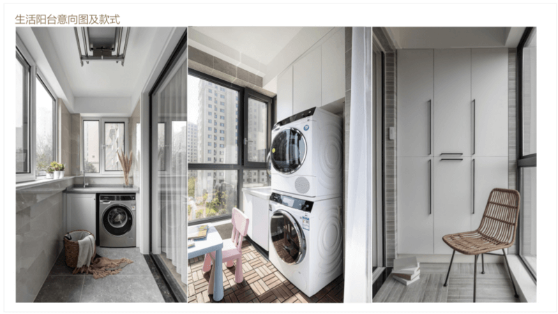 在生活阳台上设计洗衣池,可以选一体式台盆,带三面挡水。遵循上烘下洗的原则,衣服拿出来就可以穿,减少晾晒时间。转角的空间刚好收纳家政工具,适当利用洞洞板进行收纳,更加整洁。