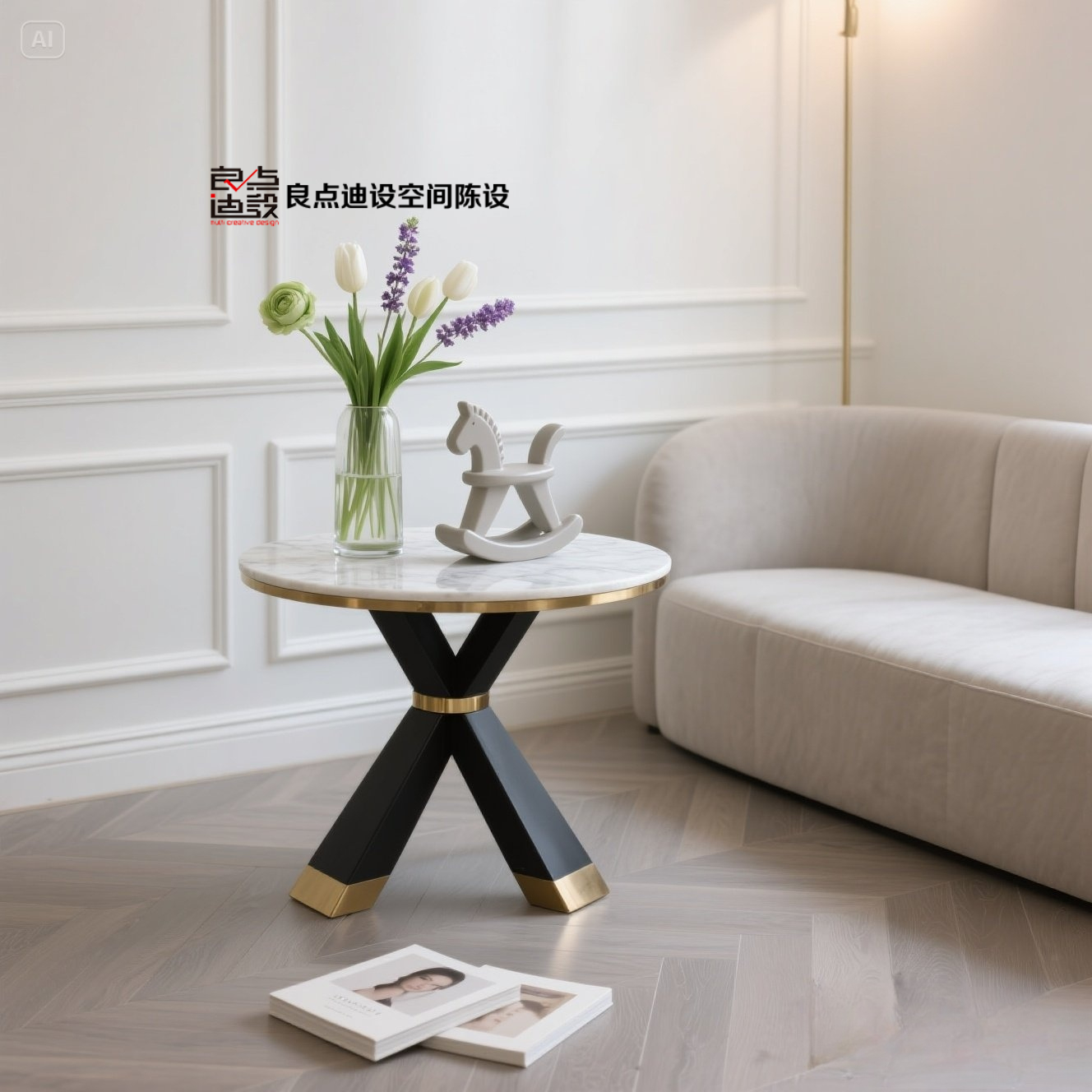 咱先看这张图里的小茶几,大理石台面搭配上金属和黑色的底座,高级感一下子就有了有木有!再配上旁边浅色系的沙发,整个色调和谐又舒服。沙发旁边还摆了一束鲜花,有白有紫,给整个空间增添了一抹灵动的气息。