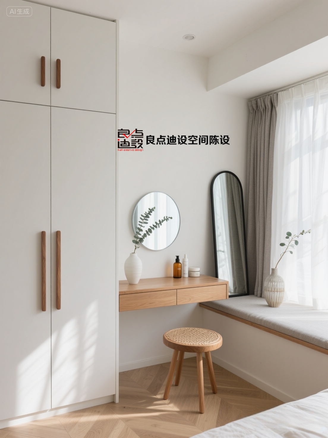 整个餐厅空间以白色和原木色为主,白墙上挂着中式风的装饰品,原木风的餐桌椅和长矮柜满足餐厅的使用和收纳需求。
