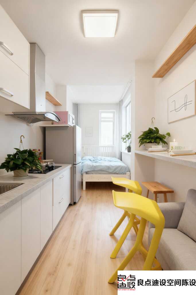我***喜欢这个设计的一点,是它用透明玻璃来做空间隔断??吞?、餐厅(或工作区)之间没有实墙挡着,光线和视线都能自由穿梭,让小户型显得倍儿宽敞、倍儿明亮。整个构图线条特别流畅,怎么看怎么舒服。