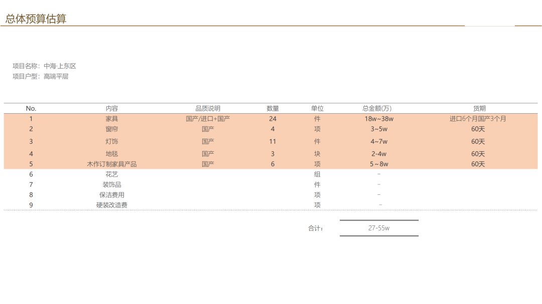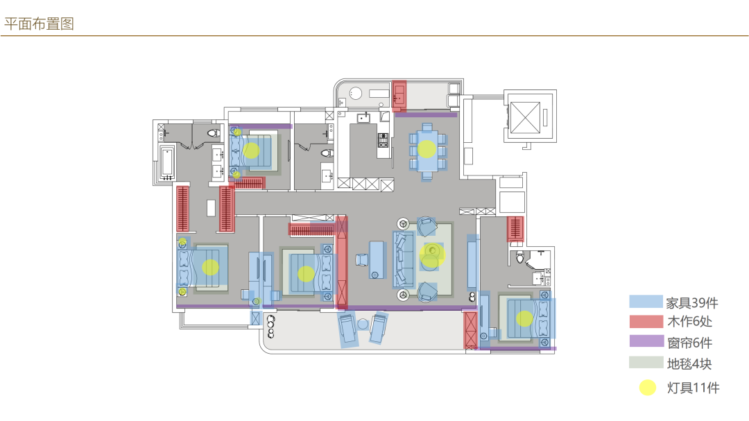 软装产品数量分析图,软装区别于硬装的是,软装是需要有产品落地的,我们能看出来,家具大致需要39件,木作大致6处,窗帘大致需要6处,地毯大概需要4块,灯具大致在11件。