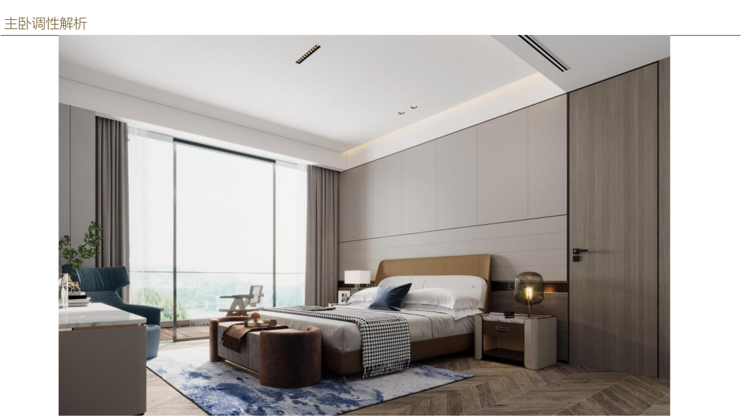 主卧室 的区域由几大功能区组成,一面墙体将寝区、更衣室区分开,墙体是用咖色材质进行隔断,柔软的材质充分体现着卧室空间的舒适属性。