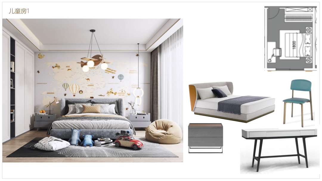 其中一间 南次卧 当做儿童房使用,床头作硬包,整体软装可以以颜色来区分小主人的性别或者以长远来看,可以用中性色为基调,以简约和性价比来装饰整个空间,房间的采光和照明比较重要,并且单独的学习区域需要宽敞一些,还需要增加一些书本的收纳。