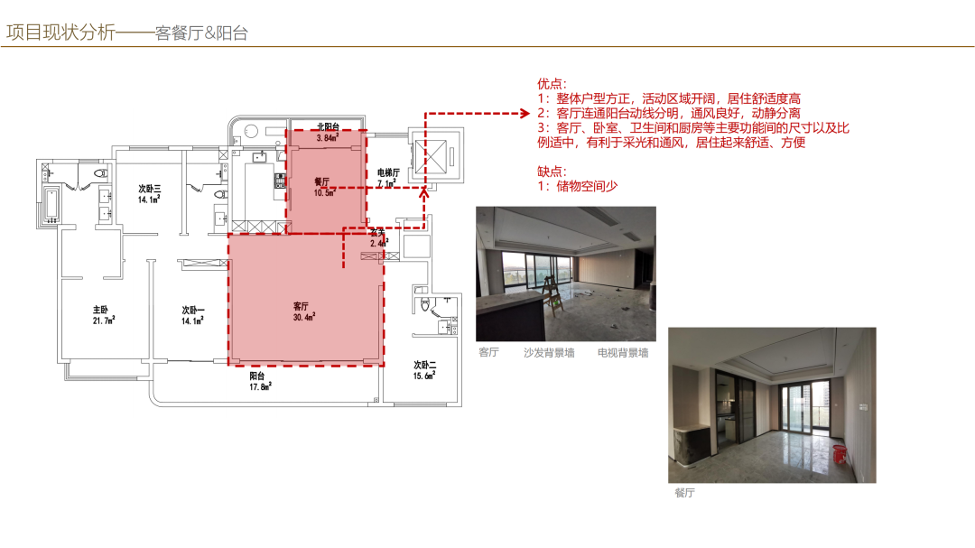 客餐厅以及阳台是一个将南北连在一起的空间,整个空间还是相对比较方正的,活动区也是比较宽阔,在这个空间里边舒适度来讲也是还不错的。