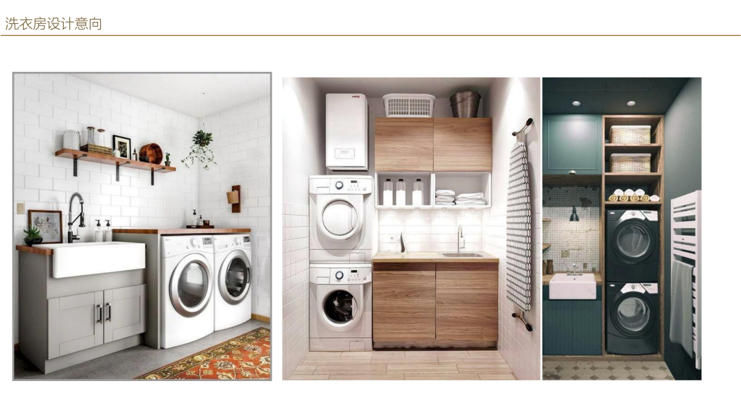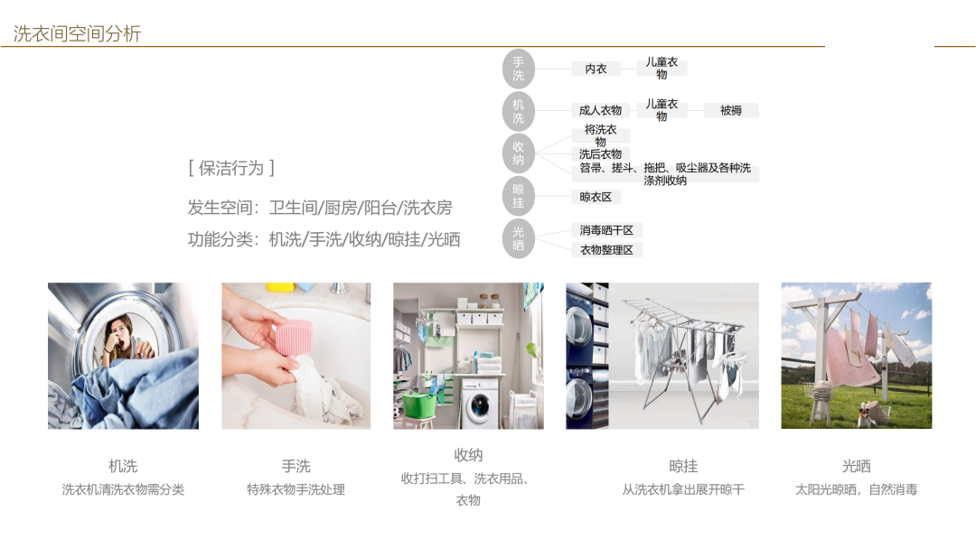 此区域为 洗衣房 ,是集机洗、手洗、晾晒和收纳的区域,可以再添加一些设备,洗衣、熨烫、收纳一条龙,并且设置单独的操作台,洗衣房不单只是洗衣的地方,也可以在这里缝补衣服,或者进行其他需要用水的活动。