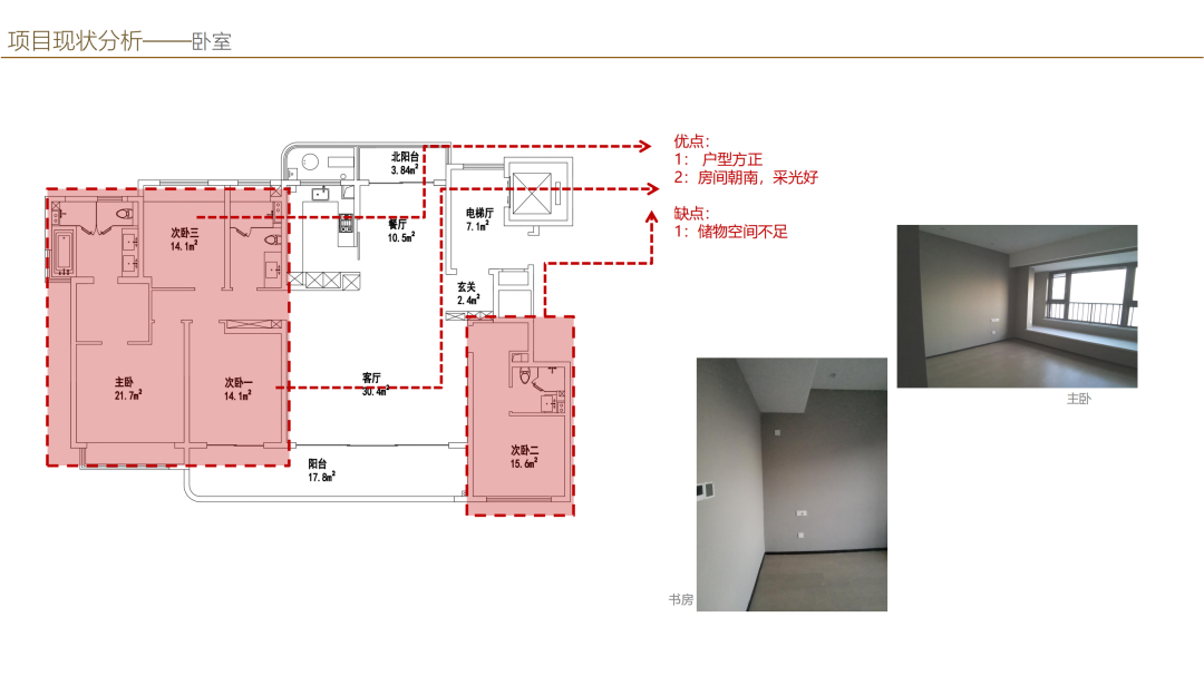 主卧、次卧以及北边的多功能房和书房,整个来讲采光和通风是还是不错的,但是比方说南边的卧室,相对来讲空间上面是比较的局促的,如果我们后期再选择家具产品,可能是要严格去把控尺寸。