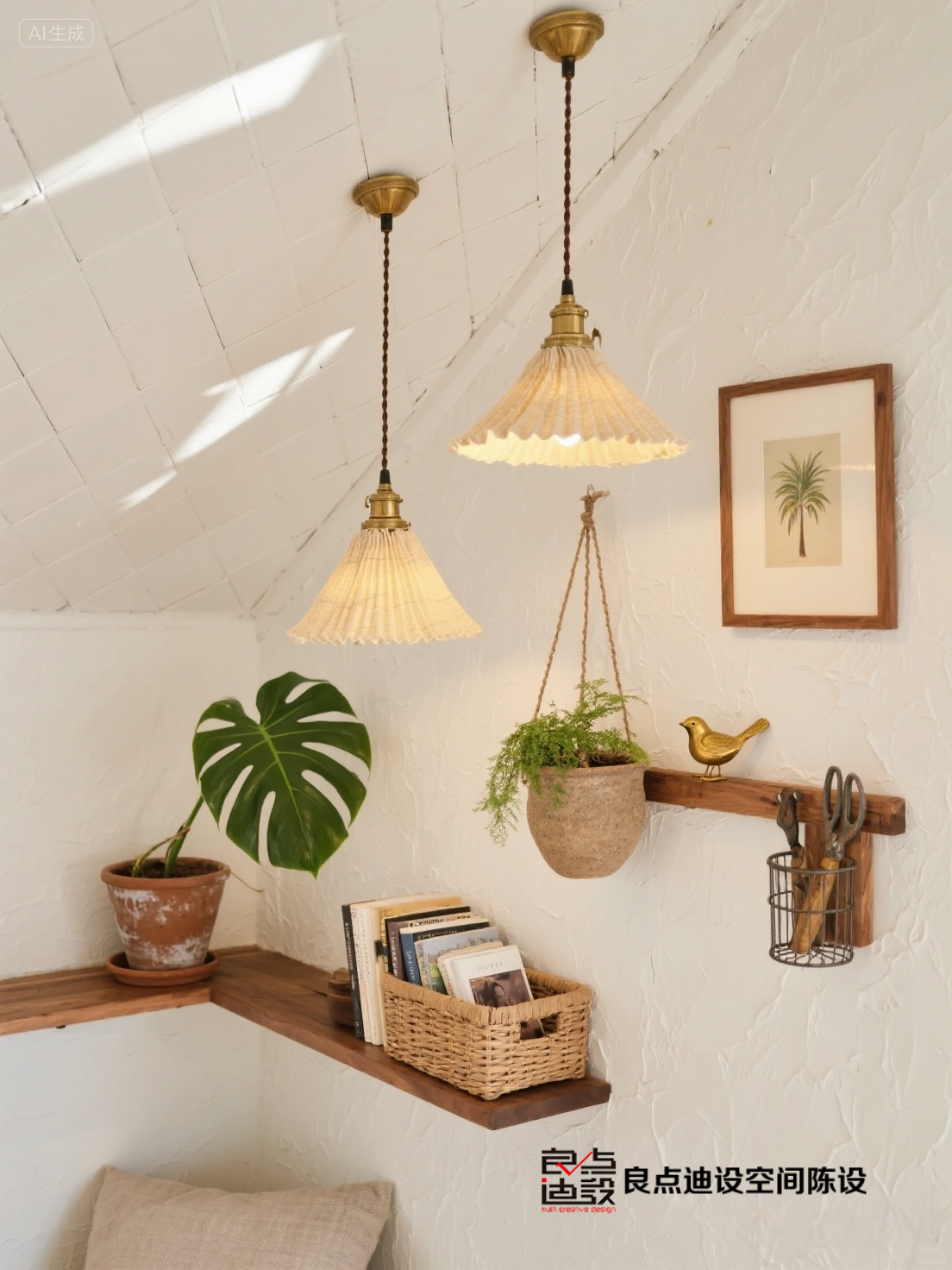 主体嘛,这张深棕色实木餐桌四件套(桌子椅子一整套,自然纹理透出高级范儿),立马定调。桌上摆个质朴陶制容器,简单却吸睛。顶上俩球形吊灯,灯光柔柔的,灯顶那木质点缀贼点睛——不刺眼,还增点暖意。整体不花哨,全是亲自然的调调。